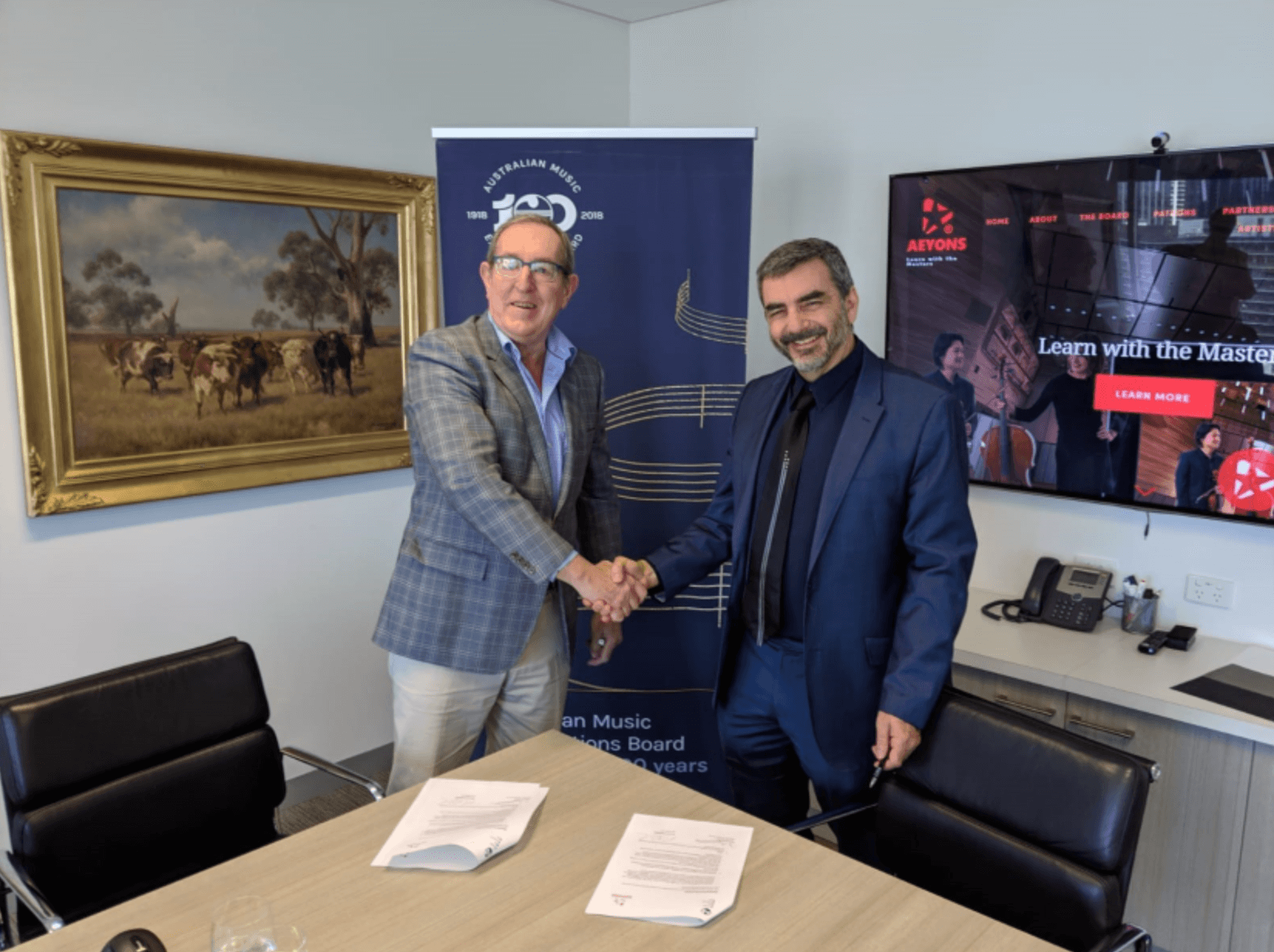 AEYONS Chairman David DeCampo and Australian Music Examinations Board CEO Bernard DePasquale sign